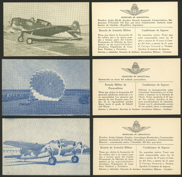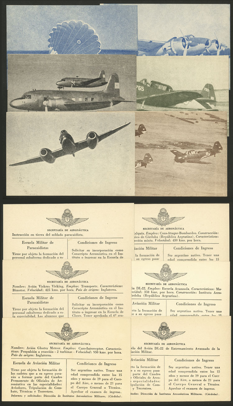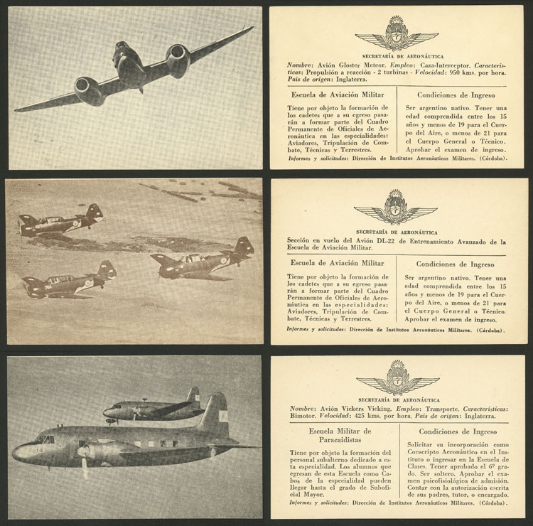 ARGENTINE AIR FORCE: Lot of 6 postcards with spectacular views and on back information to enrol in an aeronautical carreer in its various fields, all with commemorative postmarks of the 1947 Argentine Aeronautics Exposition, excellent