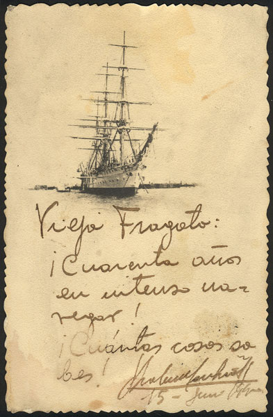FRIGATE SARMIENTO: Beautiful real photo PC of 1940, with nice manuscript inscription: "Old Frigate: 40 years of intense sailing! How much you know!", fine quality, very nice! (Image) (Image-02)
