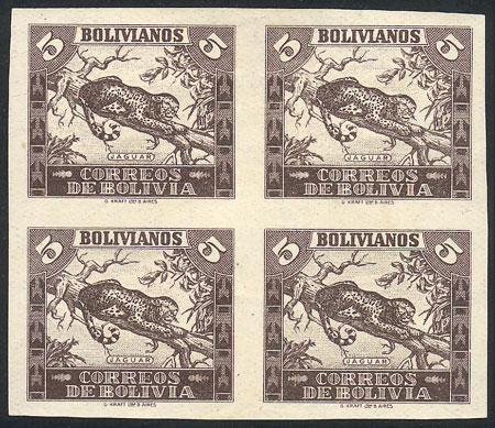 1939 5B. Jaguar, IMPERFORATE BLOCK OF 4, the top stamps lightly hinged and the bottom stamps MNH, VF quality! (Image)