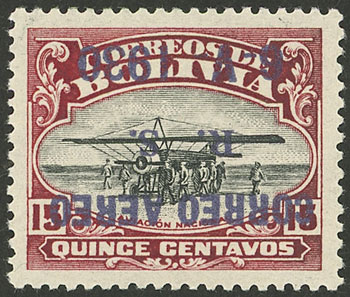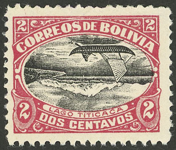 1916 2c. Reed boat in Titicaca lake with CENTER INVERTED variety, mint without gum, VF quality! (Image)