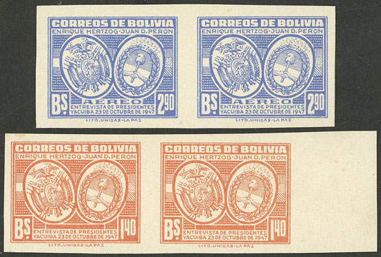 C118, 1947 Coats of arms of Argentina and Bolivia (metting of Perón and Hertzong in Yacuiba), IMPERFORATE PAIR, MNH and of excellent quality! (Image)