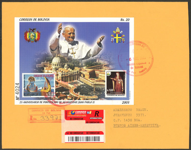 Paul II: Beautiful souvenir sheet issued in 2003 franking a registered cover sent to Argentina, excellent quality, very scarce! (Image)