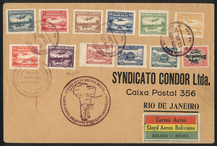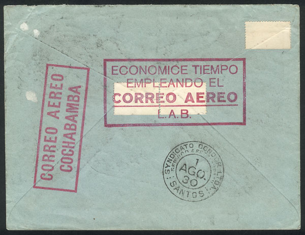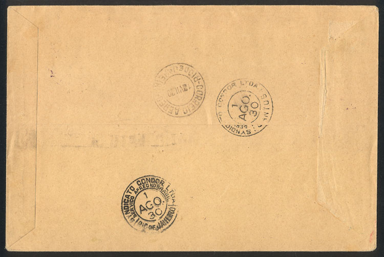 30/JUL/1930 La Paz - Rio de Janeiro, first airmail between Bolivia and Brazil, carried by Lloyd Aéreo Boliviano to Corumbá, and from there by Syndicato Condor, with arrival backstamps of 1/AU, excellent quality! (Image) (Image-02)