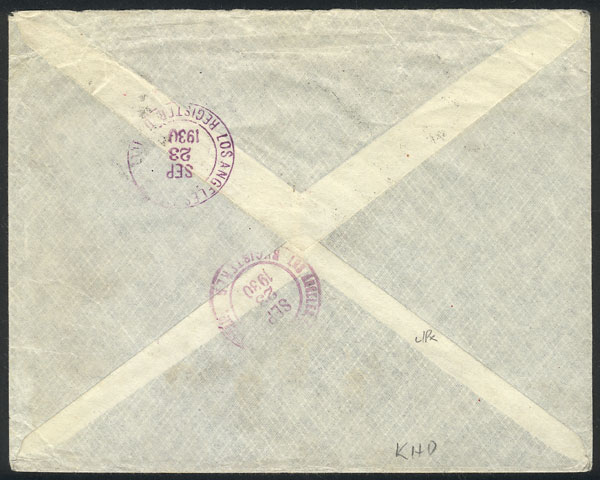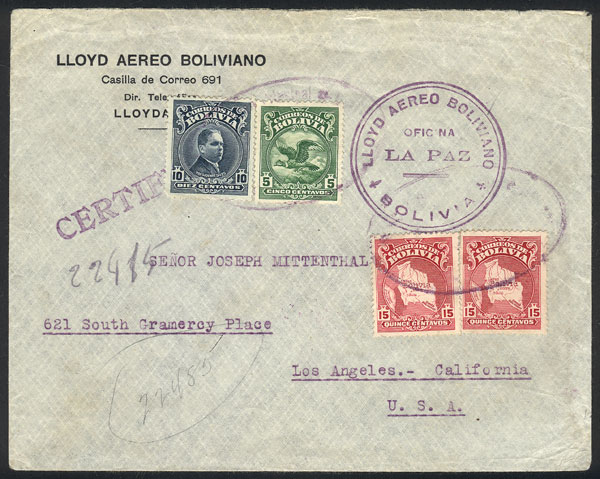 Airmail cover carried by LAB from La Paz to Los Angeles (USA) in SE/1930 franked with 45c., dispatched from LAB agency, with arrival backstamp (23/SE), VF quality! (Image) (Image-02)