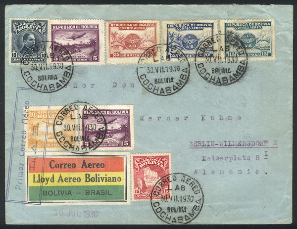 30/JUL/1930 LAB first airmail La Paz - Rio de Janeiro: Cover with final destination Germany, with Rio arrival mark on back of 1/AU, very nice!