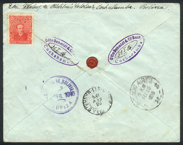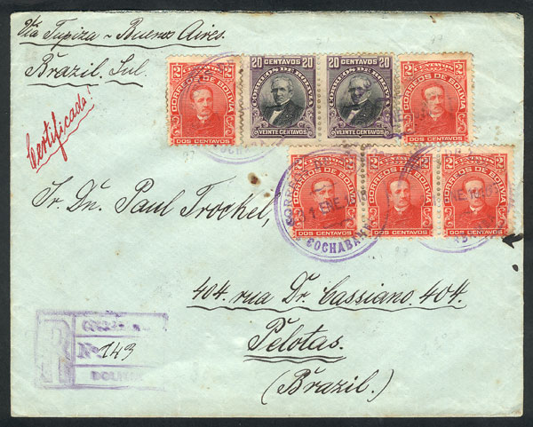 Registered cover sent from Cochabamba to Pelotas (Brazil) on 31/JA/1916 with nice postage of 50c., with transit backstamps of Tupiza and Buenos Aires + arrival, VF quality! (Image) (Image-02)