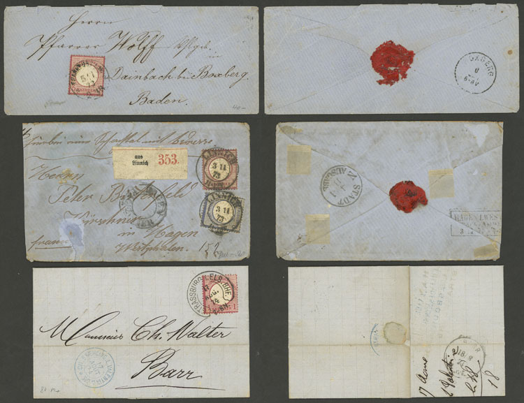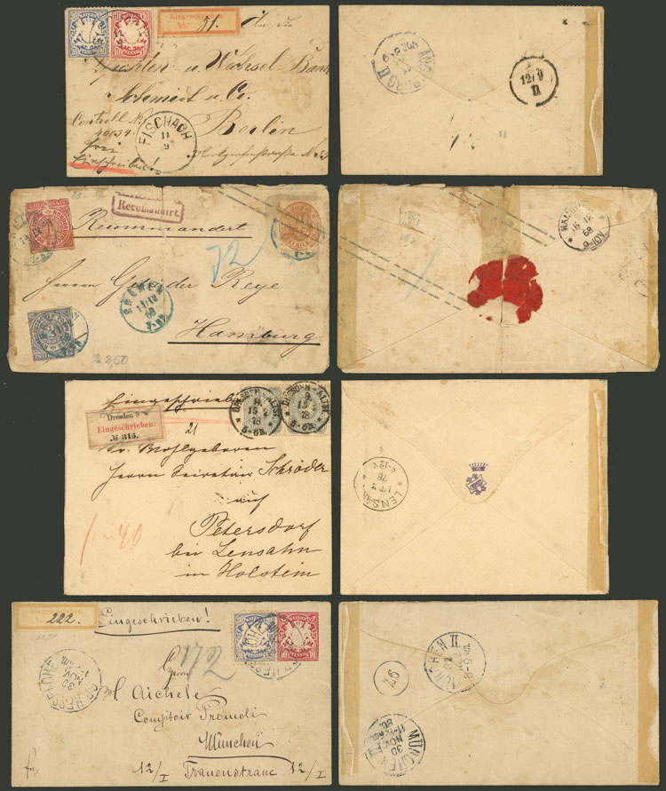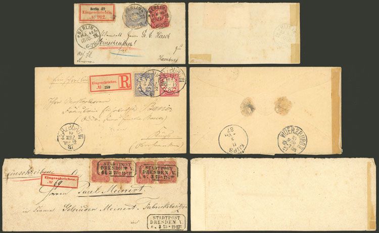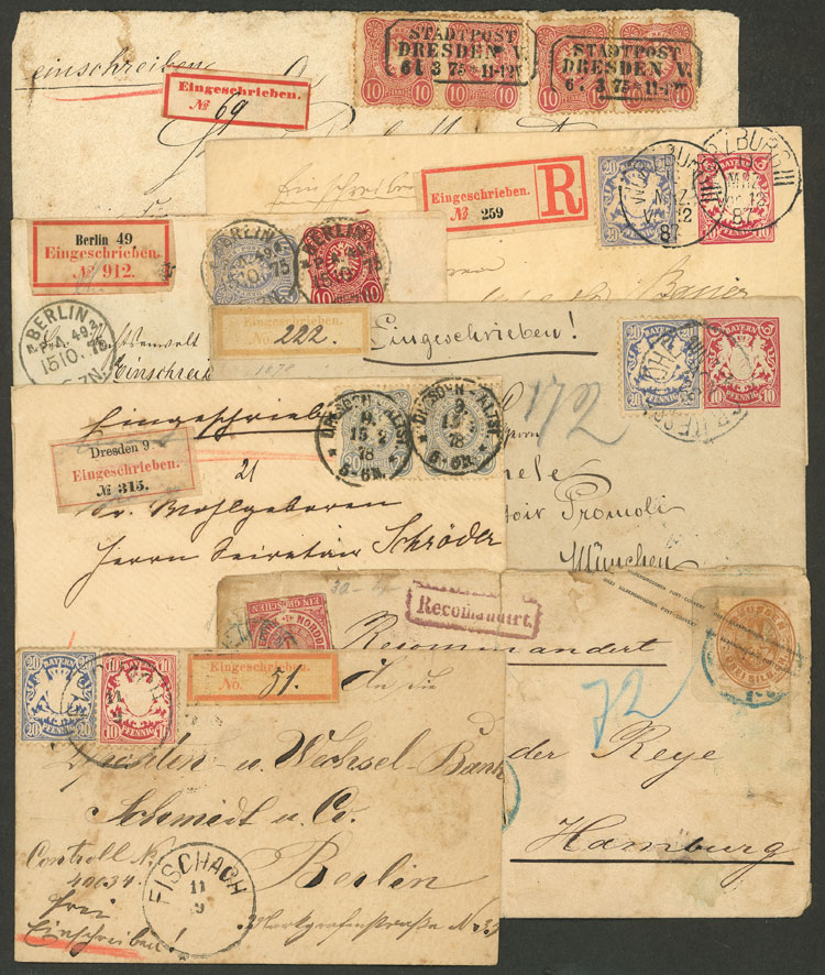 Covers + 3 cover fronts used between 1869 and 1887, all registered and with attractive postages and postal marks, mixed quality (some with defects, others of VF quality), low start! IMPORTANT: Please view ALL the photos, because allt he covers have
