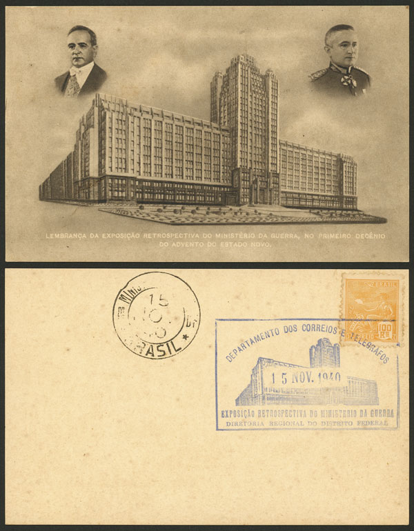 Ministry of War Building and Getúlio Vargas, souvenir card of the Retrospective Expo of the Ministry, with special postmark of back for 15/NO/1940, VF quality!