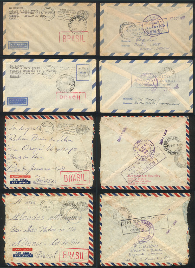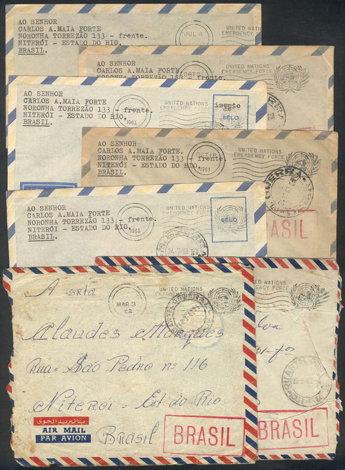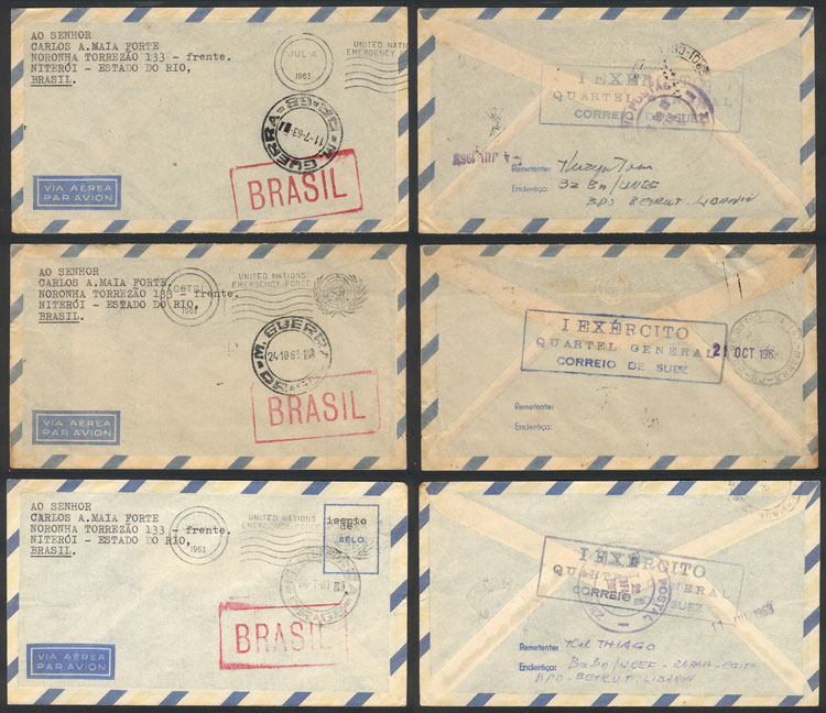 Covers posted by Brazilian soldiers of the UN Emergency Force in the Suez Canal and Lebanon in 1962/3 to their families in Brazil, with military free frank and interesting marks, most of VF quality, good lot for the specialist! (Image) (Image-02)