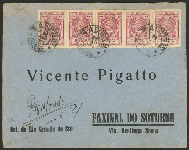 Registered cover sent from Agudo to Faxinal do Soturno on 21/AU/1941, franked by RHM.C-160 x5, VF quality! (Image) (Image-02)