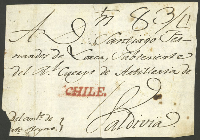 1795, front of folded cover sent from Santiago to Valdivia, with straightline "CHILE" mark perfectly applied, very nice! (Image)