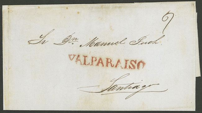 cover sent to Santiago (circa 1849) with the red VALPARAISO mark perfectly applied, excellent quality! (Image)