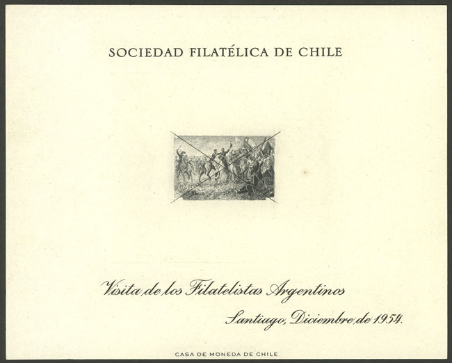 sheet without face value issued by Sociedad Filatélica de Chile to commemorate the visit of stamp collectors of Argentina, in the center it has a cancelled proof of a vignette showing San Martín and O´Higgins, issued without gum, VF quality! (Image)