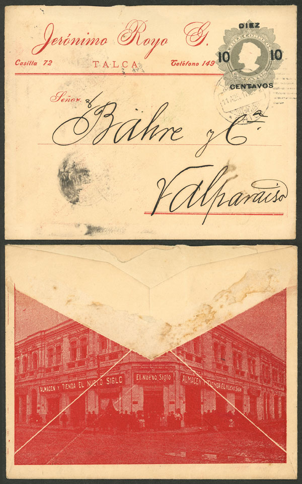 11/AP/1917 Talca to Valparaíso, provisional stationery envelope of 10c. with a commercial impression on front and back, very nice. Back flap missing else excellent! (Image)