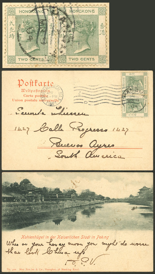 9/MAR/1904 SHANGHAI - Argentina, postcard with postage of HONG KONG (total 4c.), datestamp of Shanghai and transit mark of San Francisco for 12/AP, excellent quality! (Image)