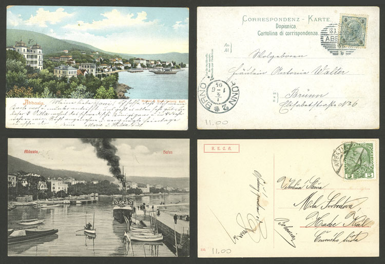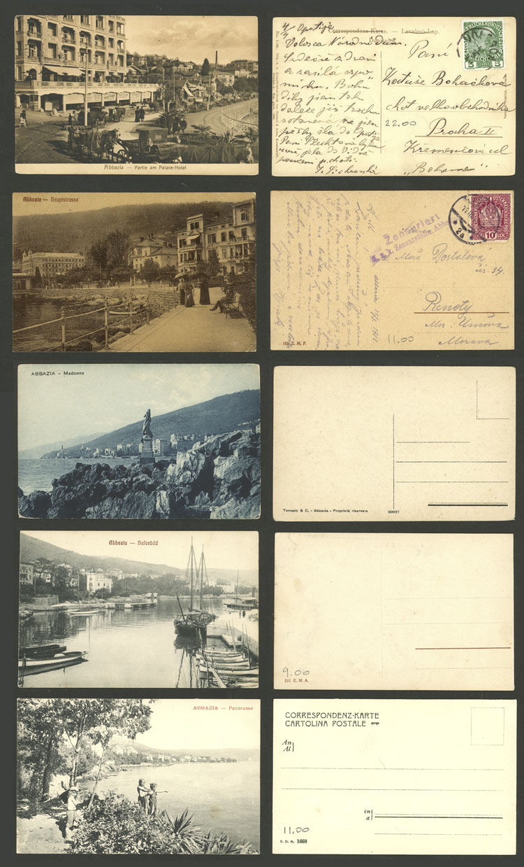 ABBAZIA: 7 Old postcards with very good views, several used with postage of Austria, VF general quality! ATTENTION: Please view all the photos of the lot, because all the cards have been scanned (both sides). (Image) (Image-02)