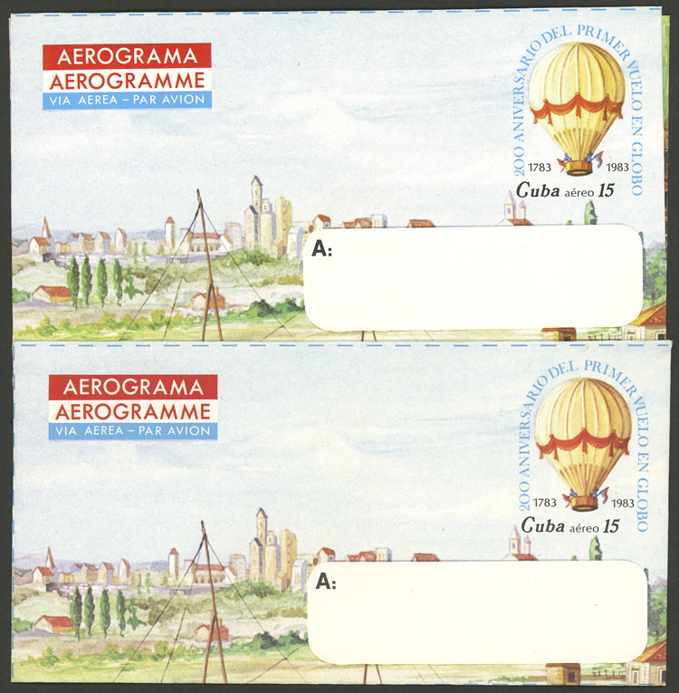 Aerogram of 1983 commemorating the 200th anniversary of 1st balloon flight, one normal printed on very glossy GLAZED paper and the other one printed on SEMI-UNSURFACED paper, less glossy, very different from the other one, very interesting! (Image)