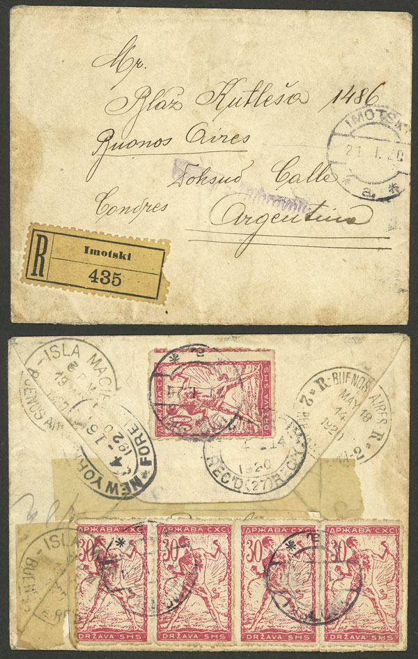 21/JA/1920 IMOTSKI (Yugoslavia) - Argentina: Registered cover with nice franking on back, also transit mark of New York 16/AP and Buenos Aires arrival 18/MAR, a fragment was cut out and re-affixed, else excellent, rare origin (for the