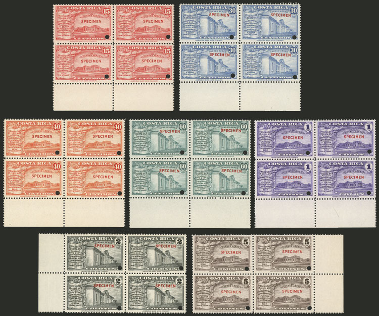 Sc.64/70, 1946 University of San José, set of 7 values with SPECIMEN overprint and punch hole, blocks of 4 of VF quality! (Image)