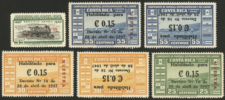 SPECIMENS + VARIETIES: 6 Airmail stamps overprinted "MUESTRA" or "SPECIMEN", or with inverted overprints, very interesting lot! (Image)
