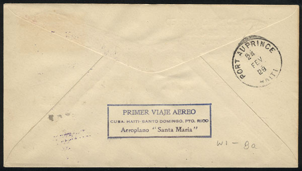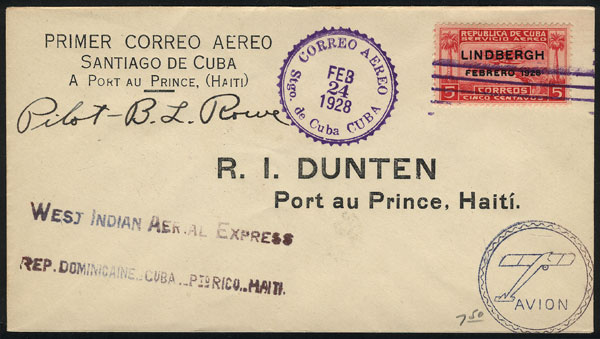 23/FE/1928 Santiago de Cuba - Port Au Prince (HaitI) first flight, signed by the pilot B.L.Rowe, with arrival backstamp, VF quality! (Image) (Image-02)