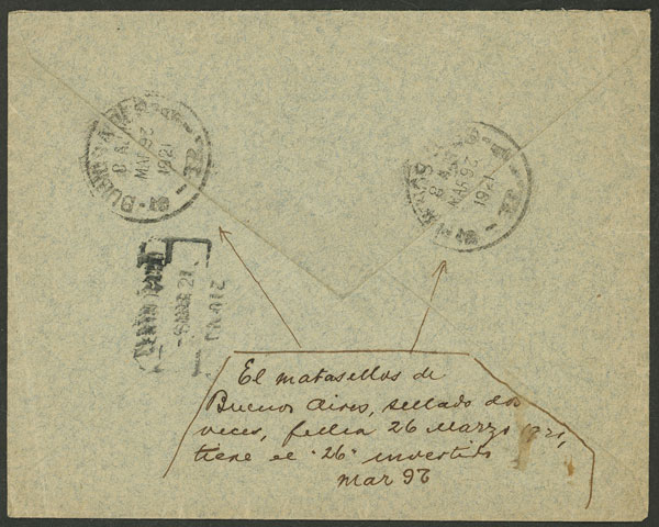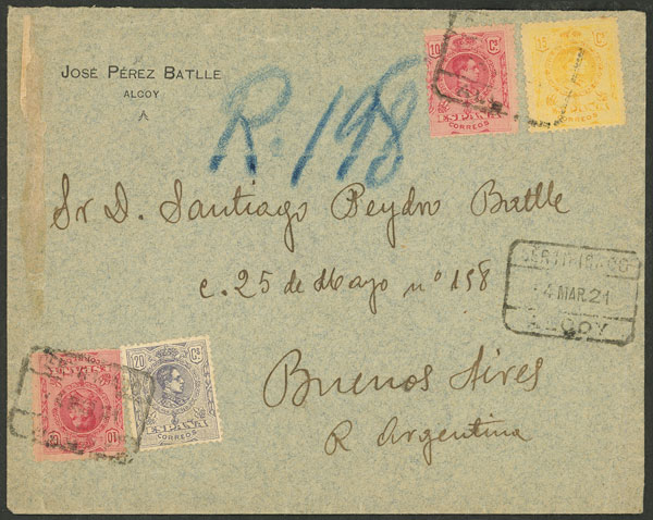 4/MAR/1921 ALCOY to Argentina, registered cover franked with 55c., and arrival backstamp of B.Aires 26/MAR, VF quality! (Image) (Image-02)