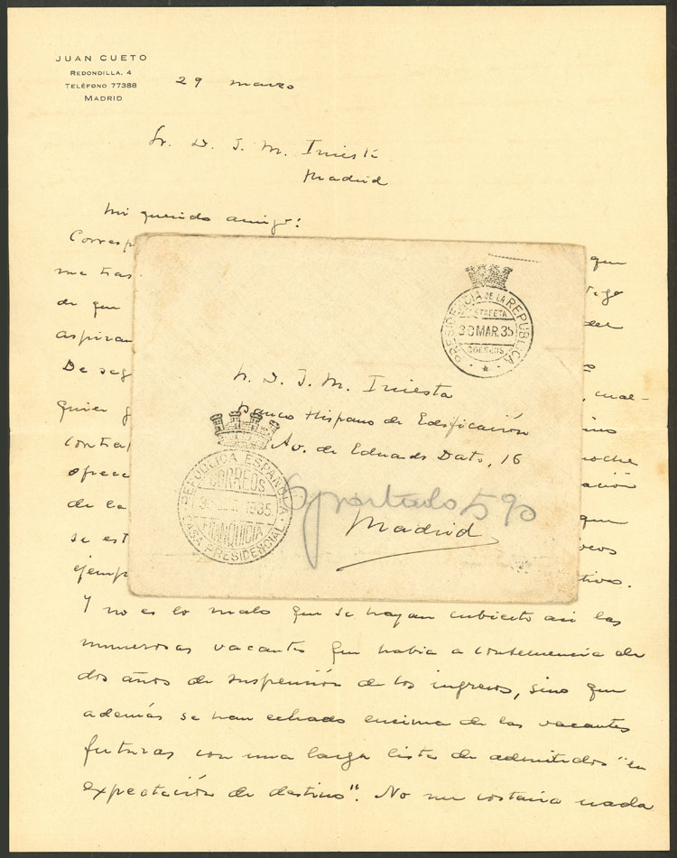 HAND-WRITTEN LETTER OF JUAN CUETO and official envelope: Long letter written by Lieutenant Colonel Juan Cueto Ibañez (executed in 1937 after the fall of Bilbao to Francoist troops) with an account of the situation about admissions to the