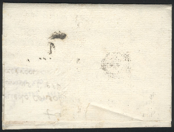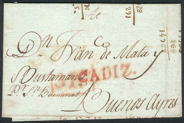 1780: Undated folded cover sent to Buenos Aires, with red "CADIZ" and "3 P." markings, very nice! (Image)