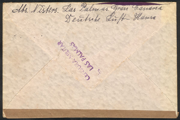 Airmail cover franked with stamp with local overprint of the Canary Islands 50c. + 1.25Pts., sent from Las Palmas to Germany on 2/OC/1937, with censor mark of the Civil War on reverse, excellent quality, rare postage! (Image) (Image-02)
