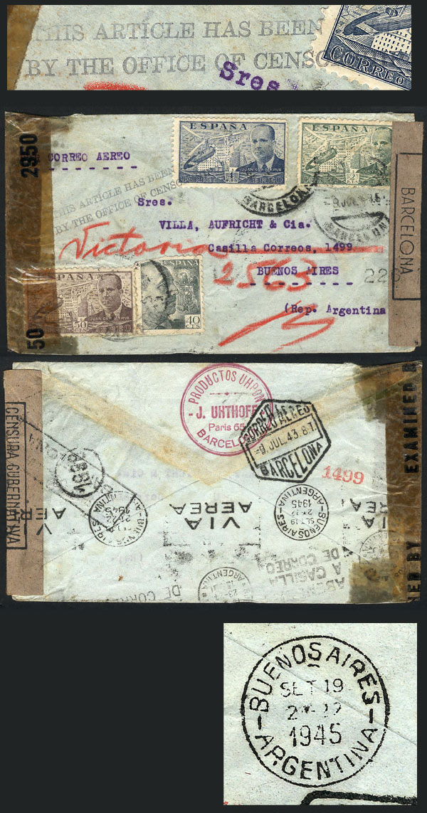 BY CENSORSHIP: Airmail cover sent from Barcelona to Argentina on 9/JUL/1947, with DOUBLE censorship (Spanish and Allied), and interesting mark: 'THIS ARTICLE HAS BEEN HELD BY THE OFFICE OF CENSORSHIP', and it was released 2 years later, Buenos Aires