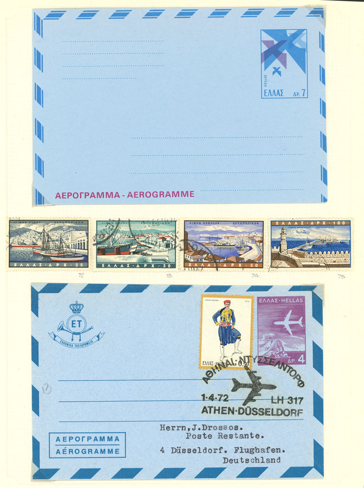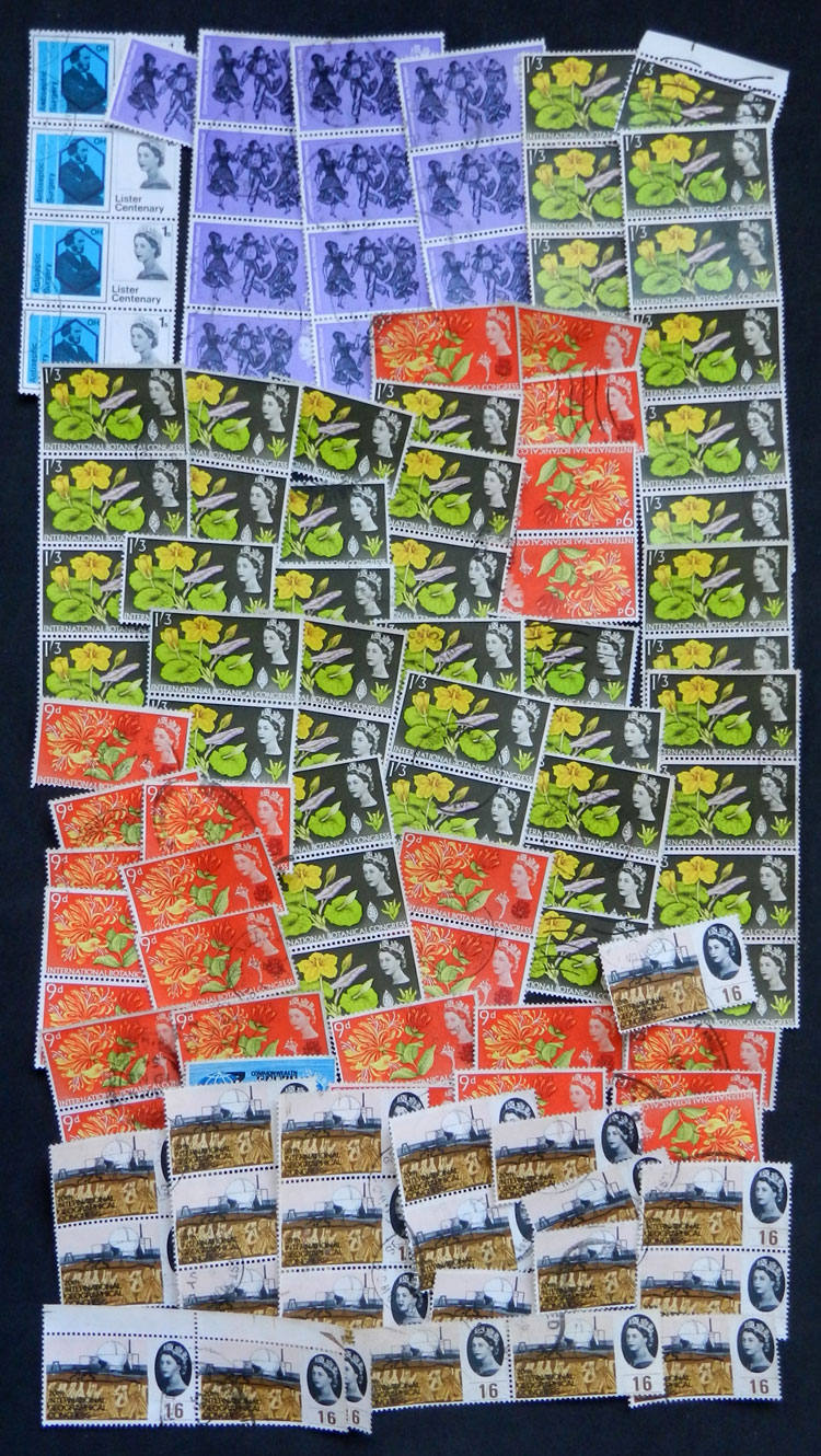 lot with some old stamps of high value + a used block of 4 of Sc.391p (WITH phosphor bands) + Sc.392p x19 (all WITH phosphor bands), also an old IRC. Very fine general quality, VERY LOW START! (Image)