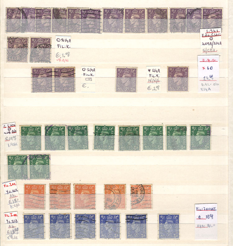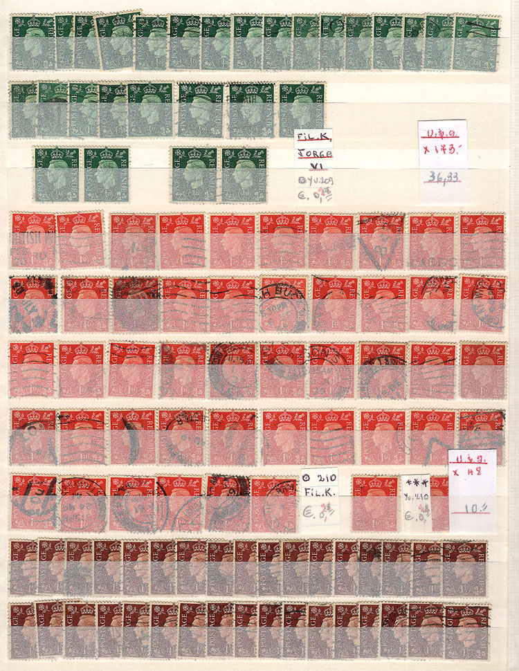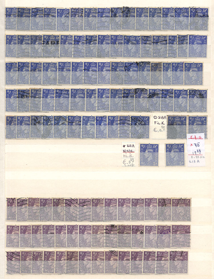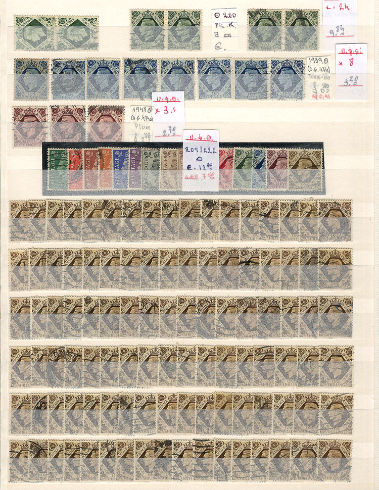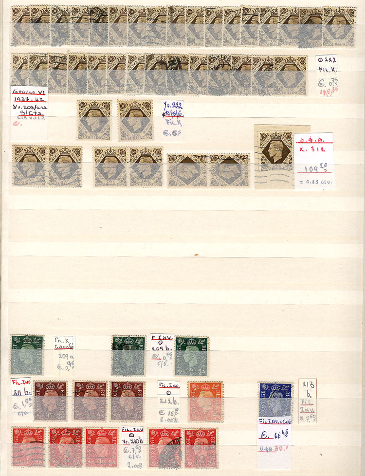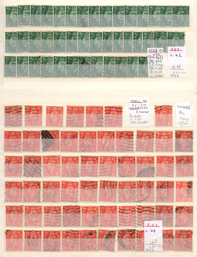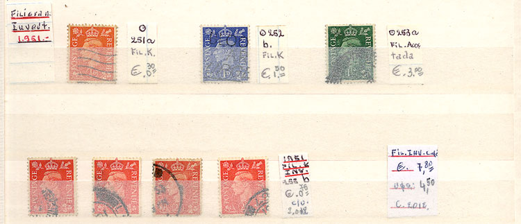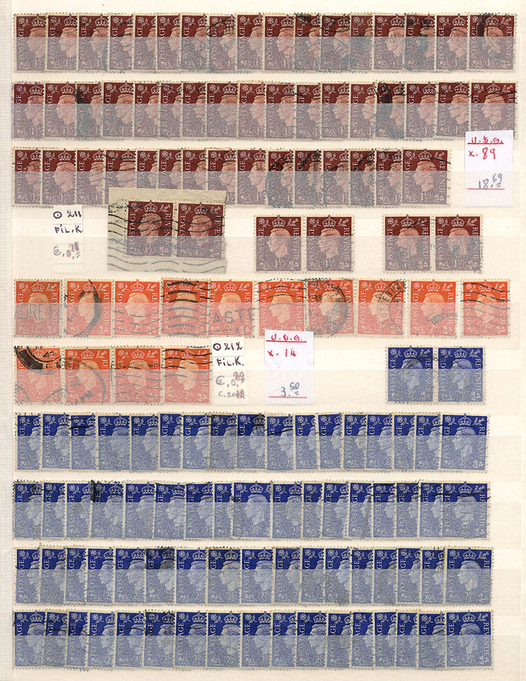 Several hundreds used definitive stamps (George VI) mounted in 2 stockbooks, including some examples with inverted watermark, and there are also some color varieties. Interesting lot for the specialist, low start! (Image) (Image-02)