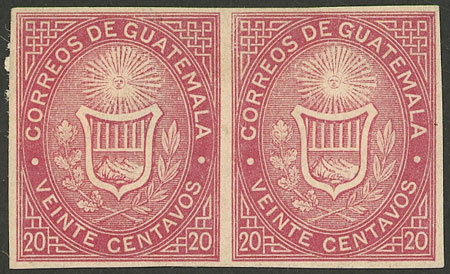 1871 20c. rose in IMPERFORATE PAIR, with thin on back, good front! (Image)