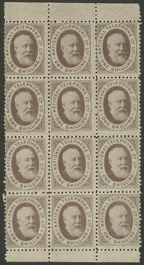 National Telephone Co., 1 Shilling, beautiful block of 12 stamps, very fine quality! (Image)