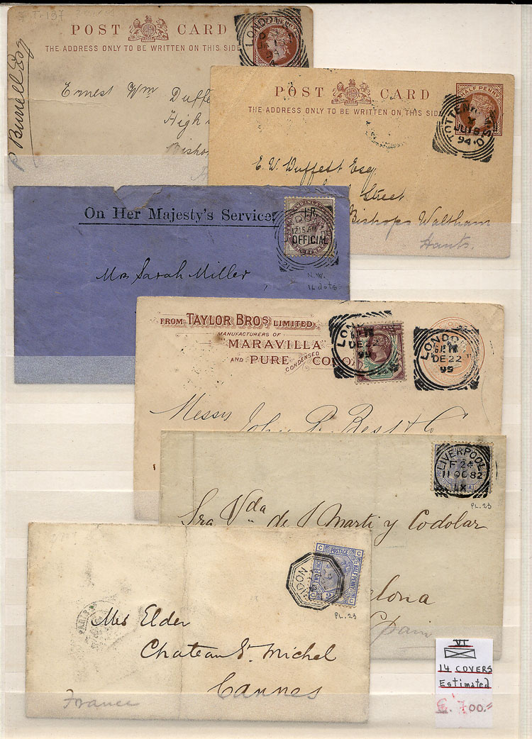 CANCELS: Stockbook with several hundreds used stamps and 14 covers or cards with interesting cancels, fine to VF general quality, HIGH CATALOGUE VALUE (the previous owner calculated an estimate of Euros 7,000 according to Yvert, which we