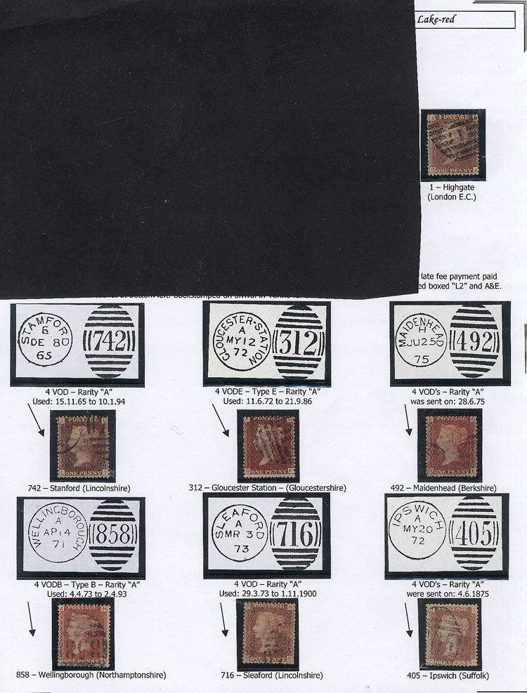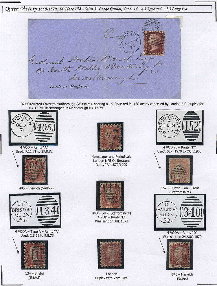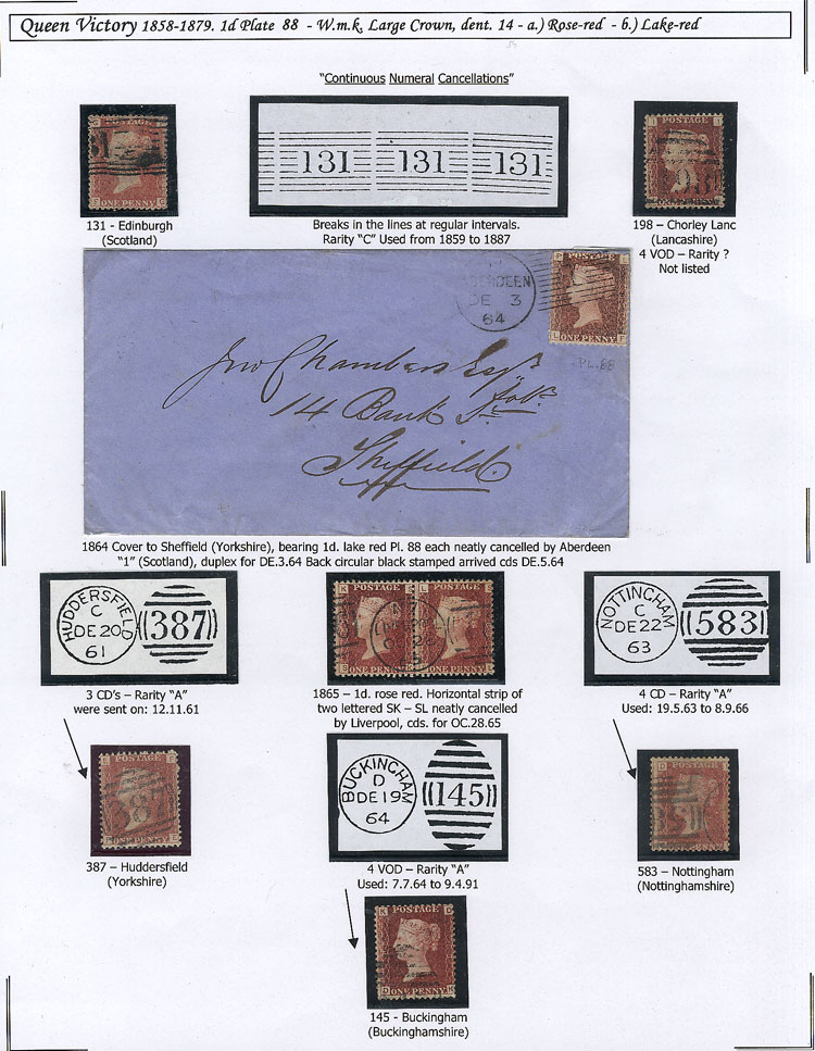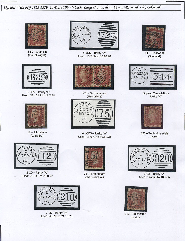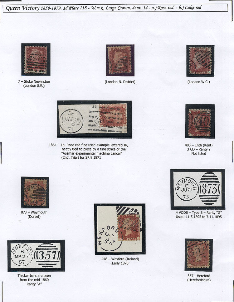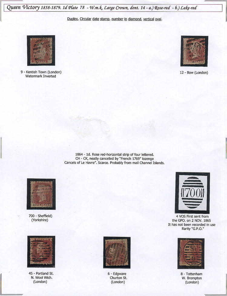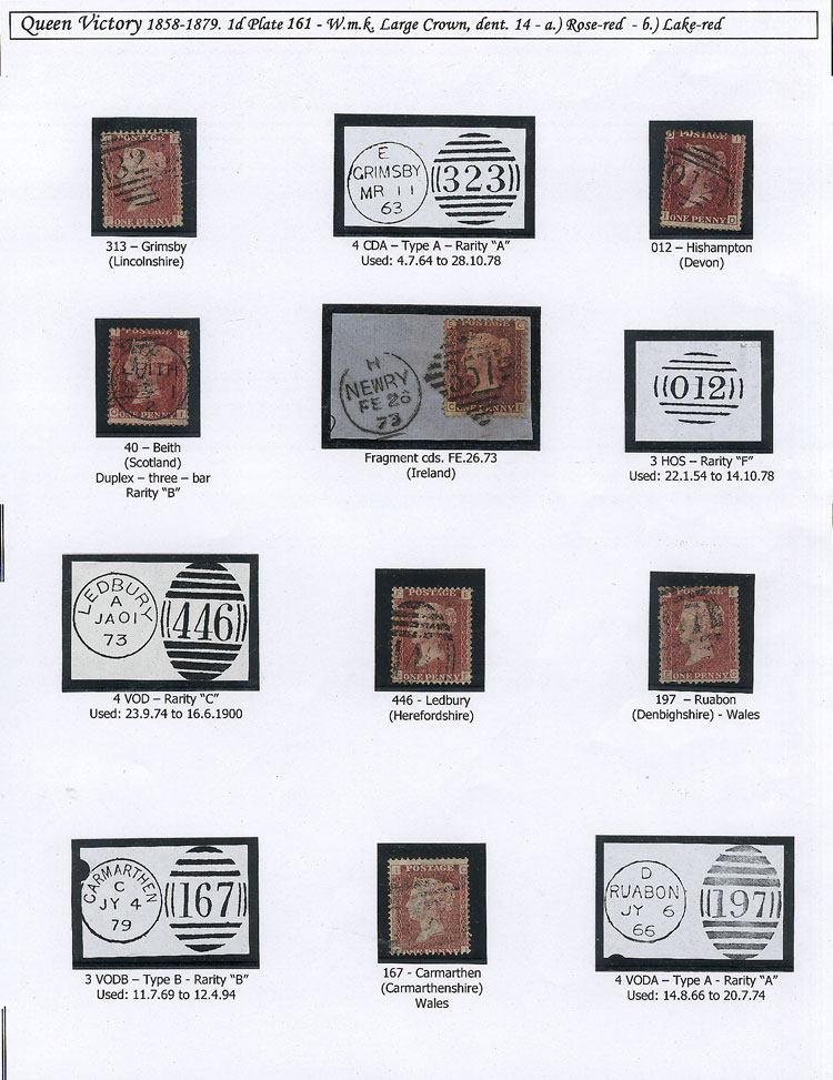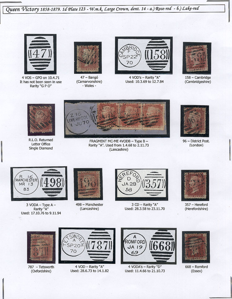 CANCELS on the 1p. of 1864 (Sc.33, SG.43), developed on pages according to the plate number, including some multiples, fragments and several covers (in total 44 covers and 449 stamps that include fragments, pairs and even a strip of 6!),