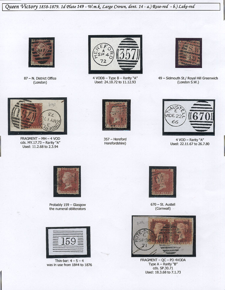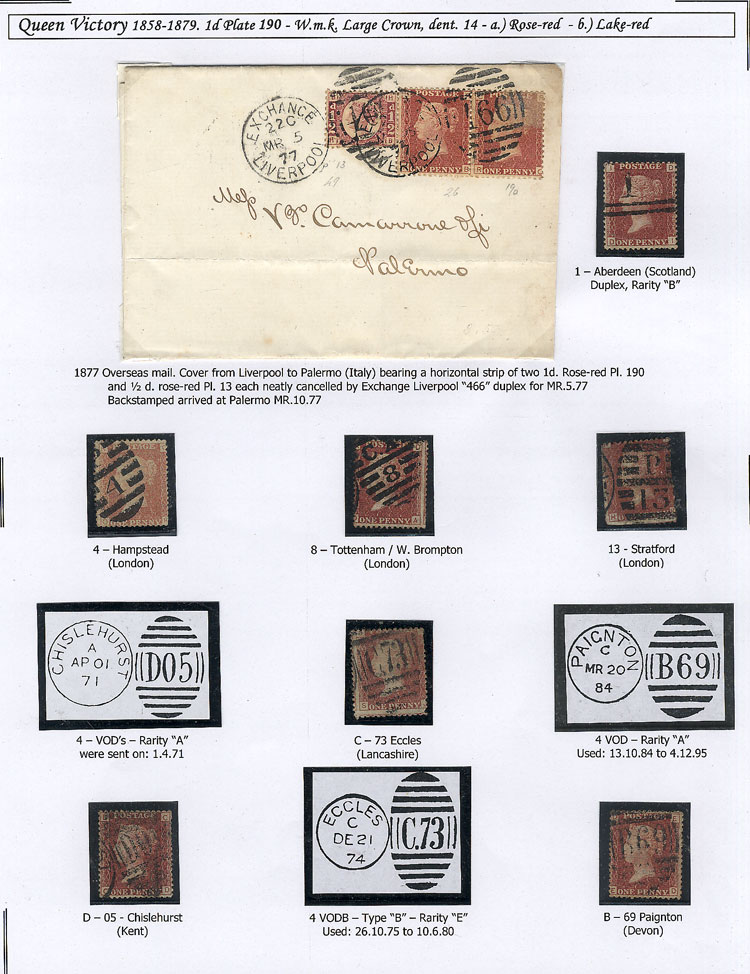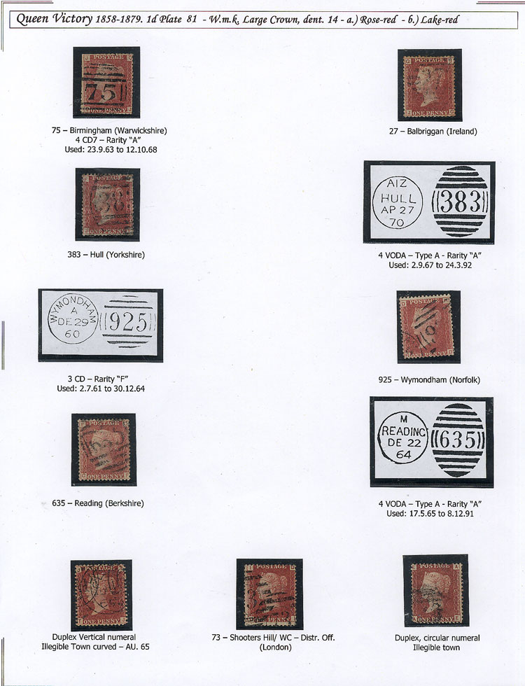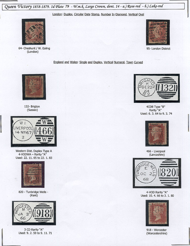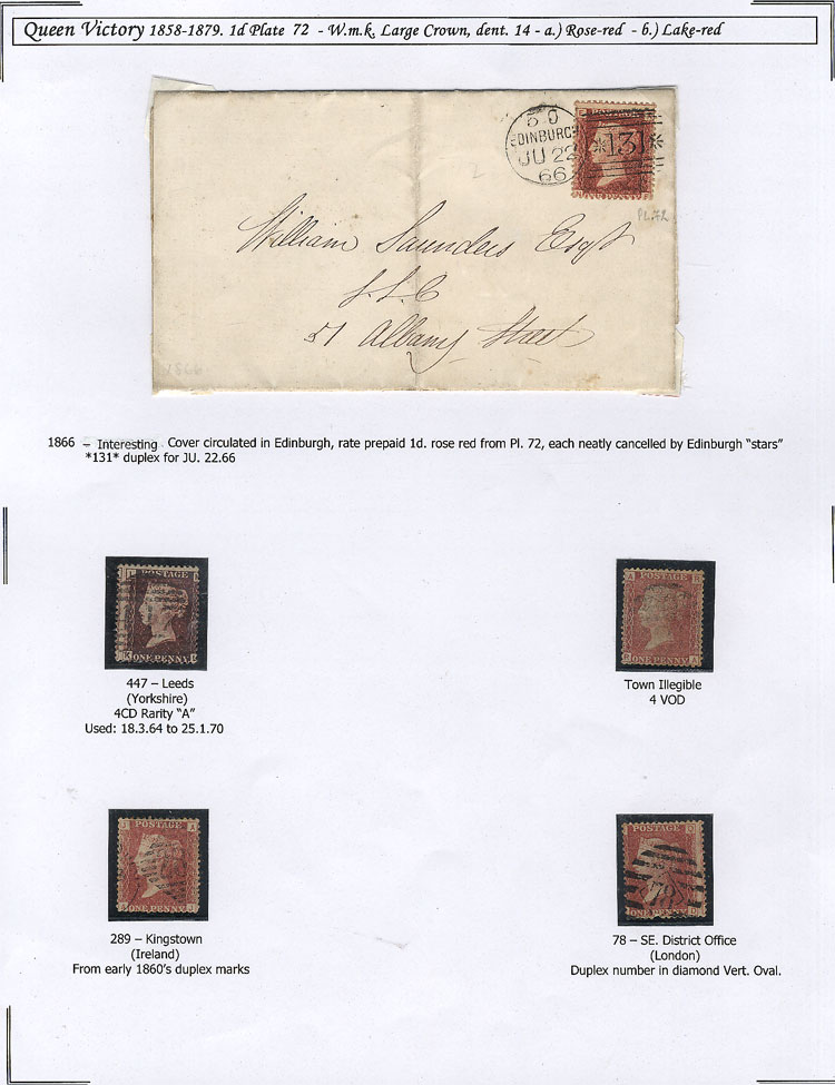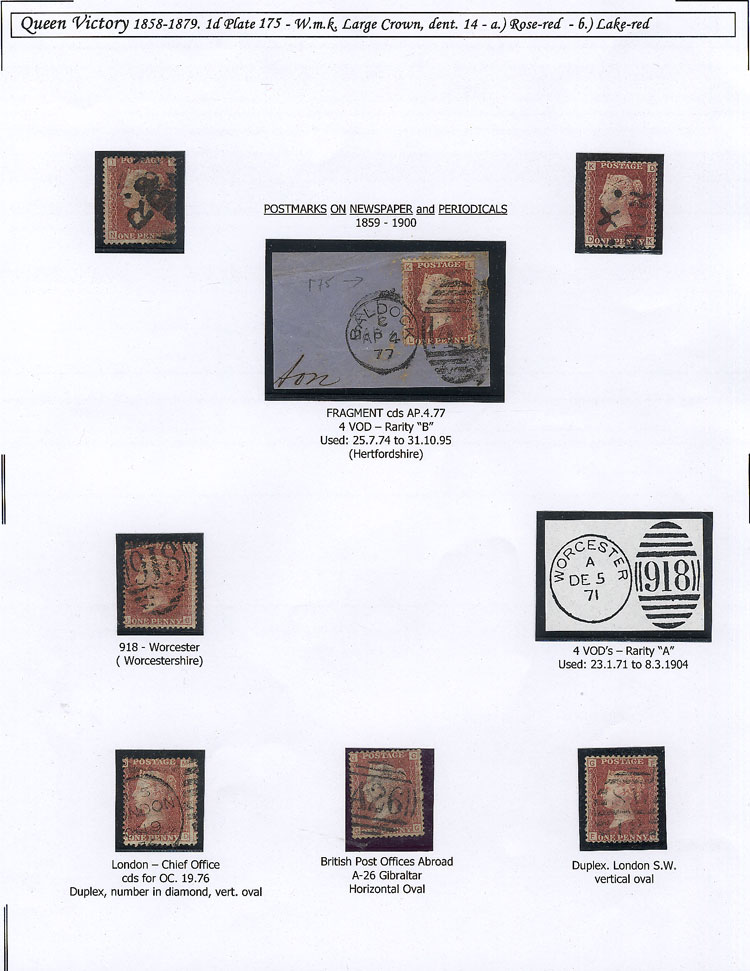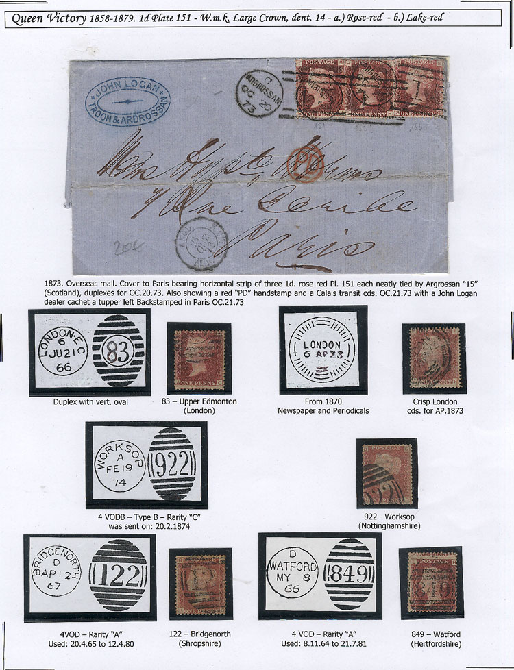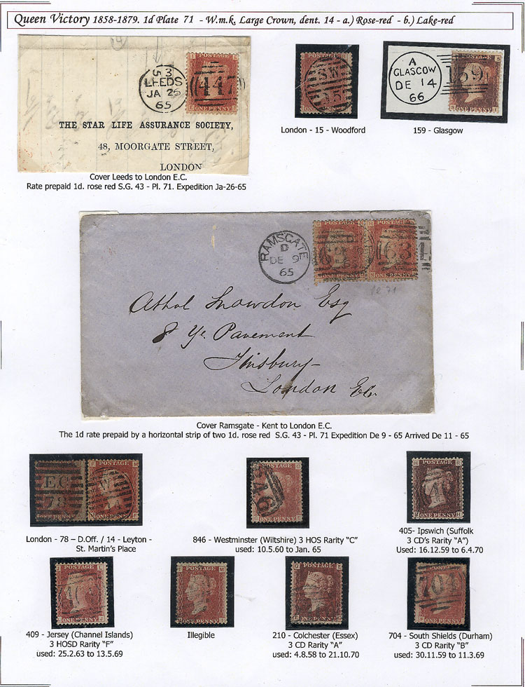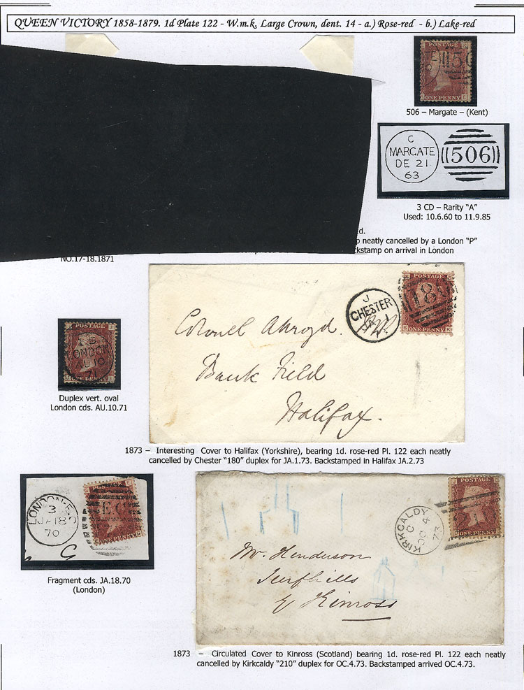 CANCELS on the 1p. of 1864 (Sc.33, SG.43), developed on pages according to the plate number, including some multiples, fragments and several covers (in total 44 covers and 449 stamps that include fragments, pairs and even a strip of 6!),