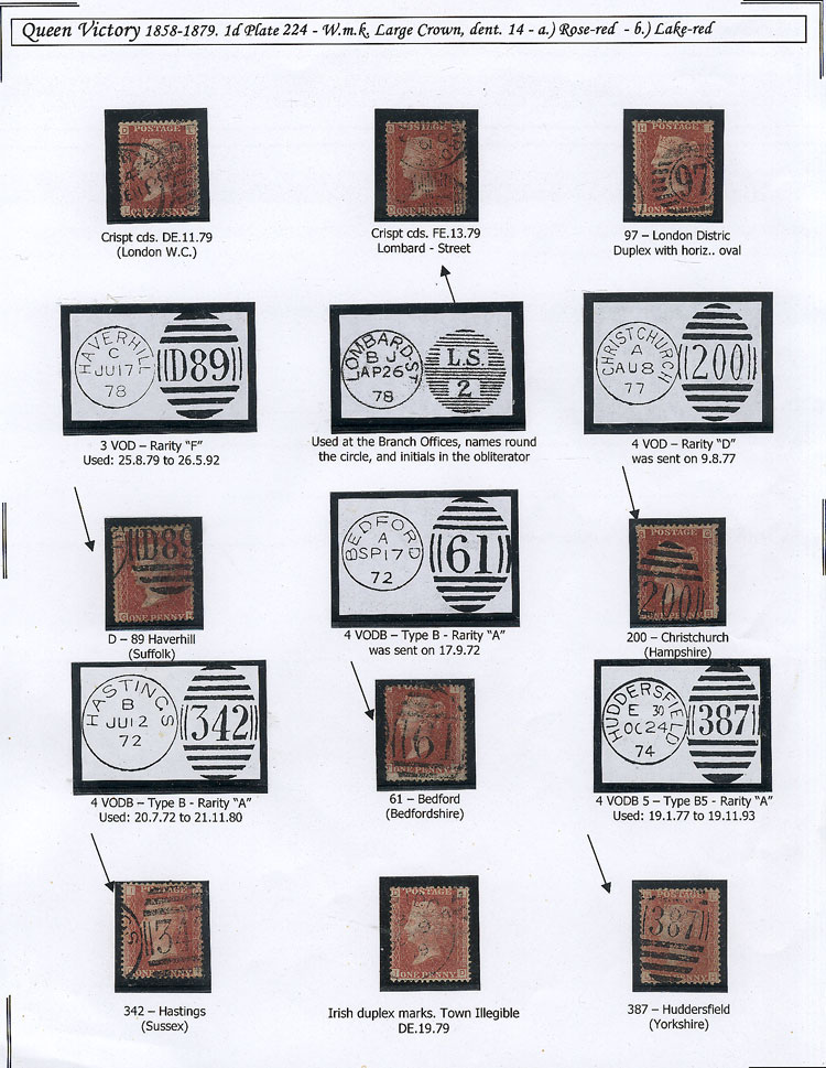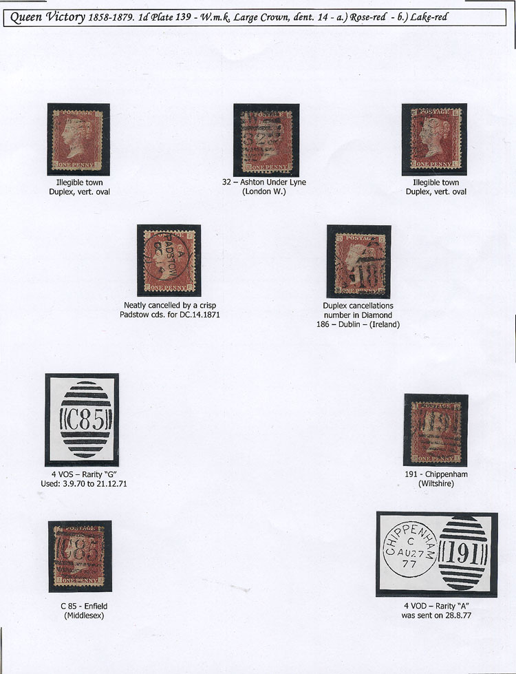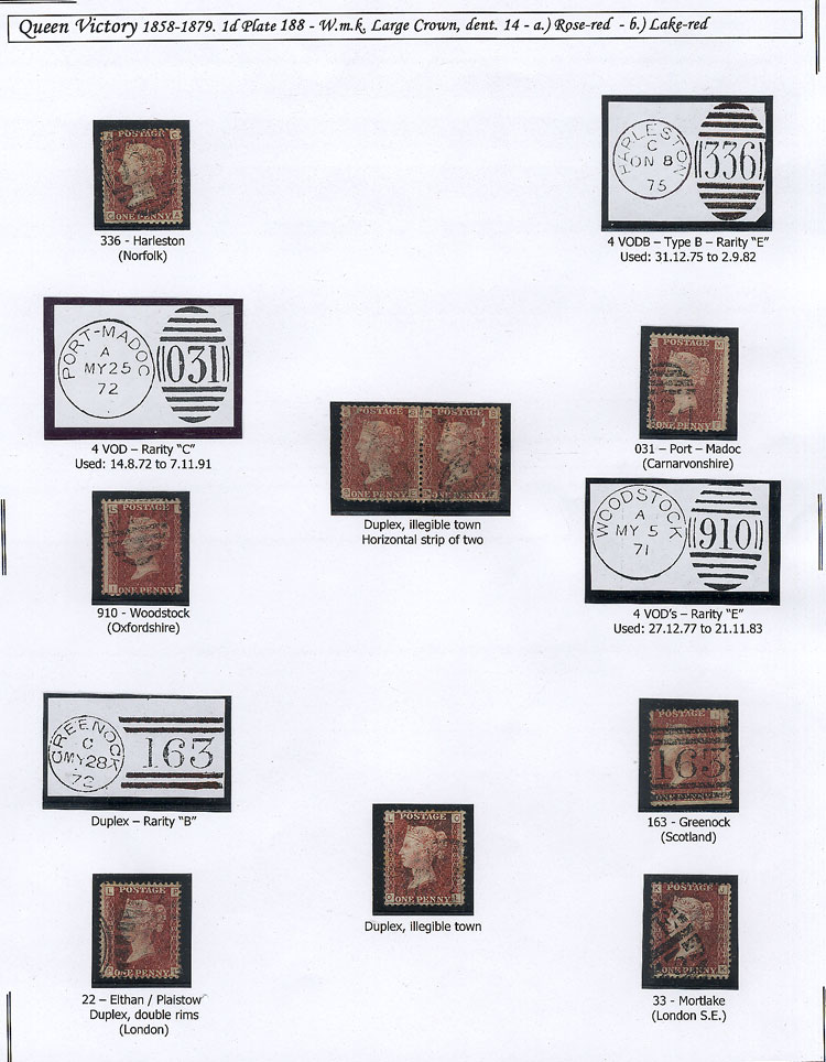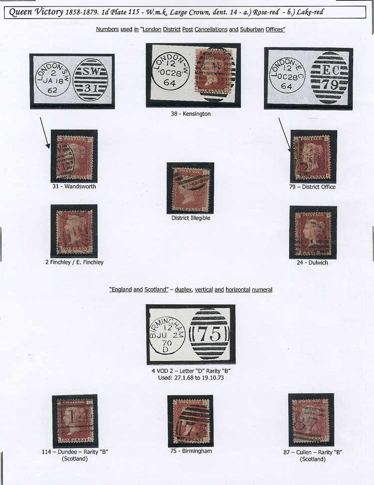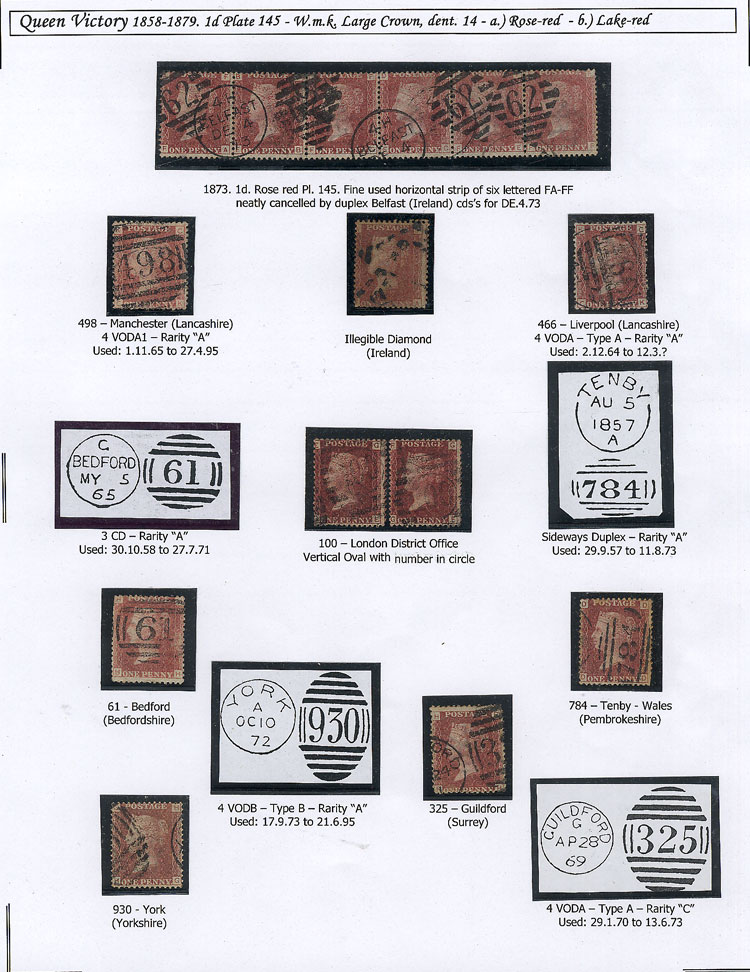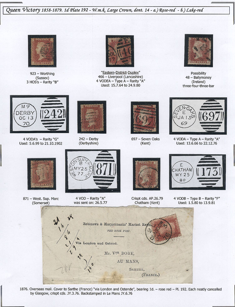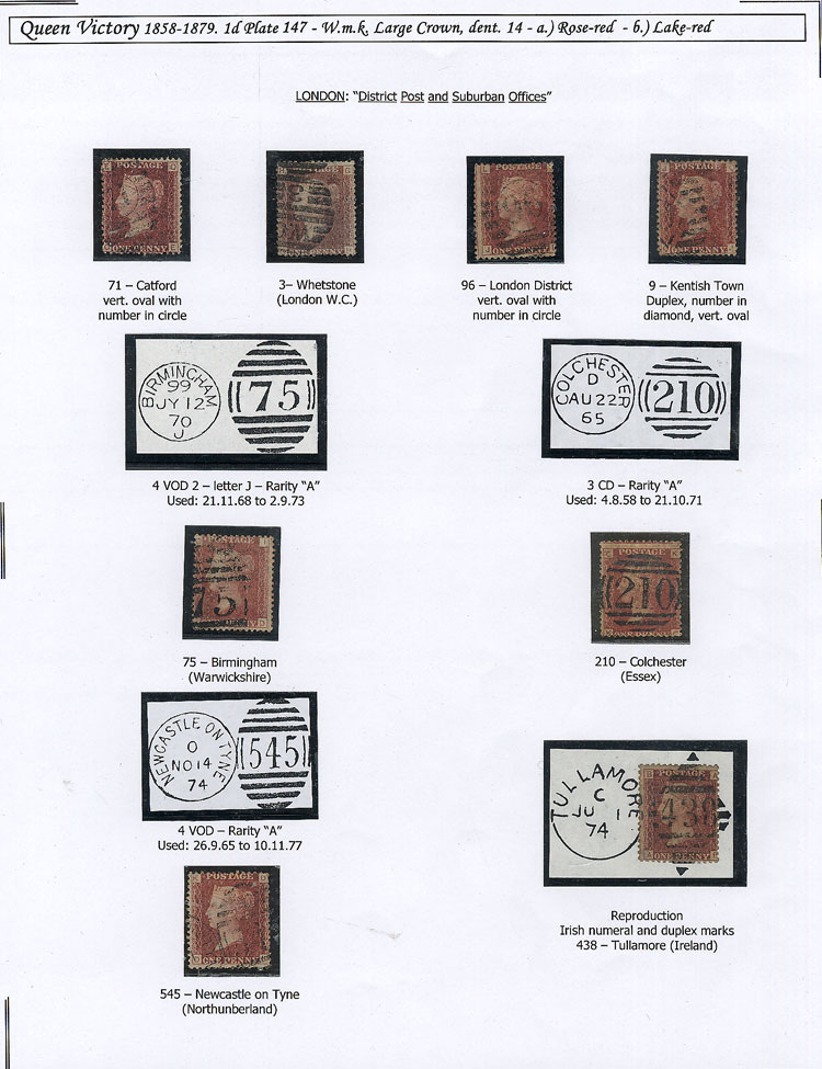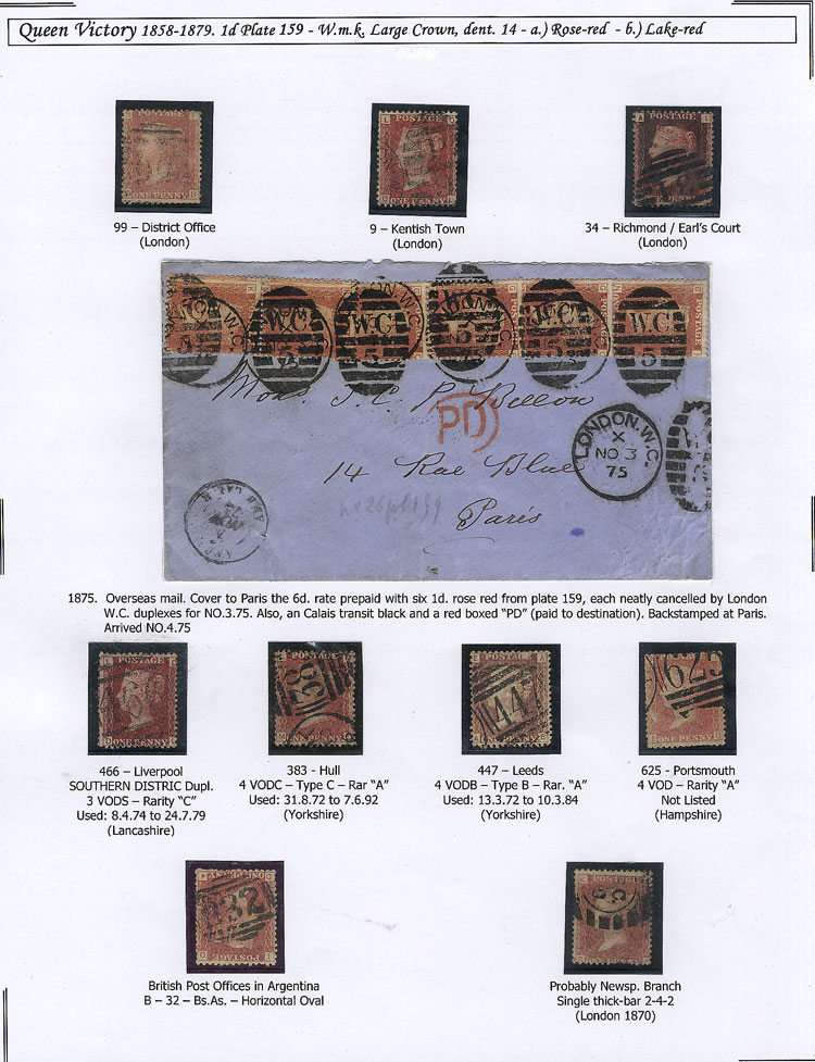 CANCELS on the 1p. of 1864 (Sc.33, SG.43), developed on pages according to the plate number, including some multiples, fragments and several covers (in total 44 covers and 449 stamps that include fragments, pairs and even a strip of 6!),