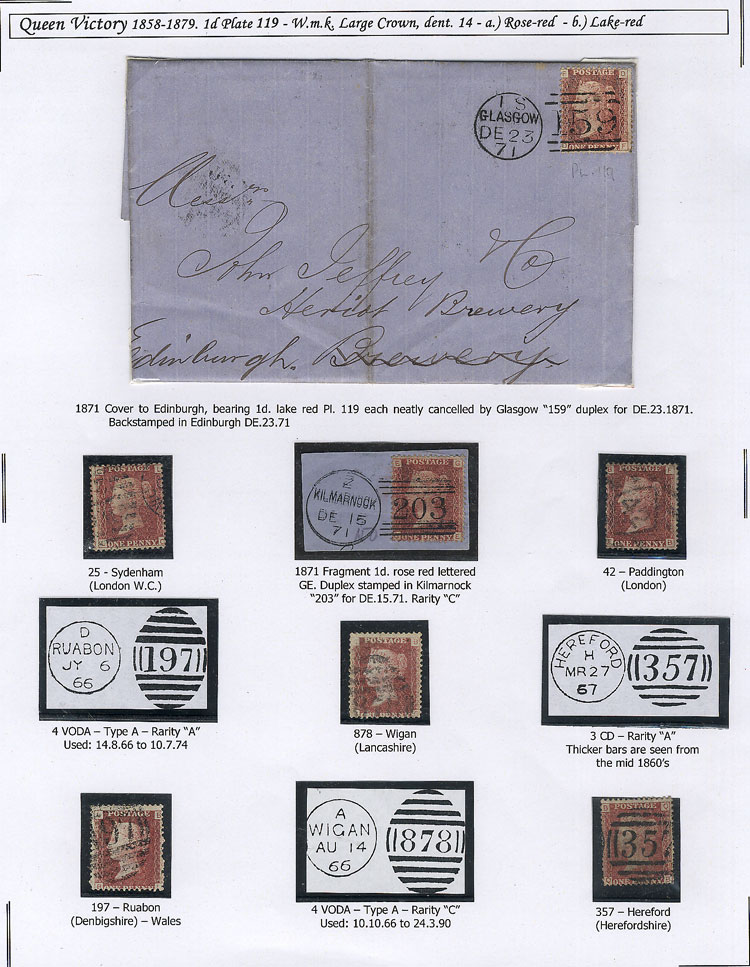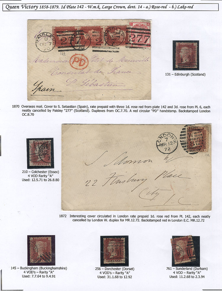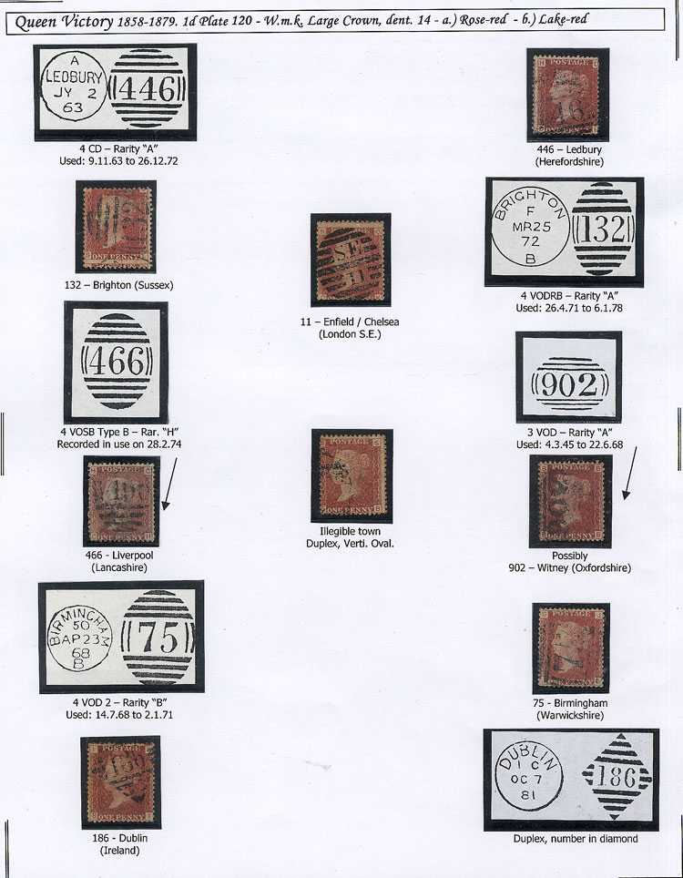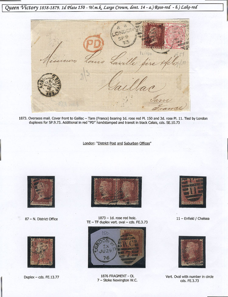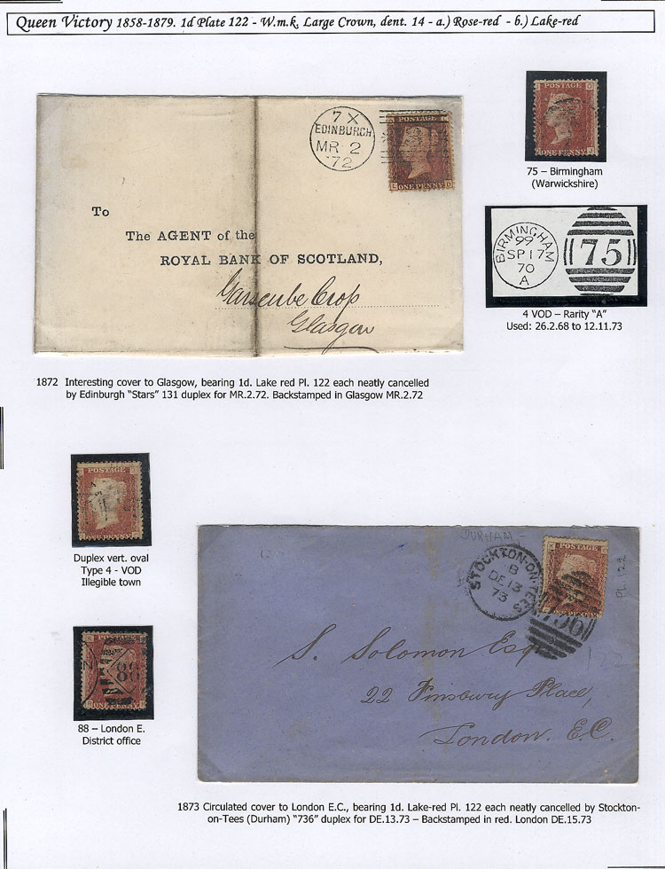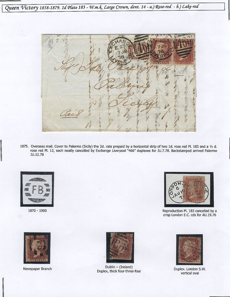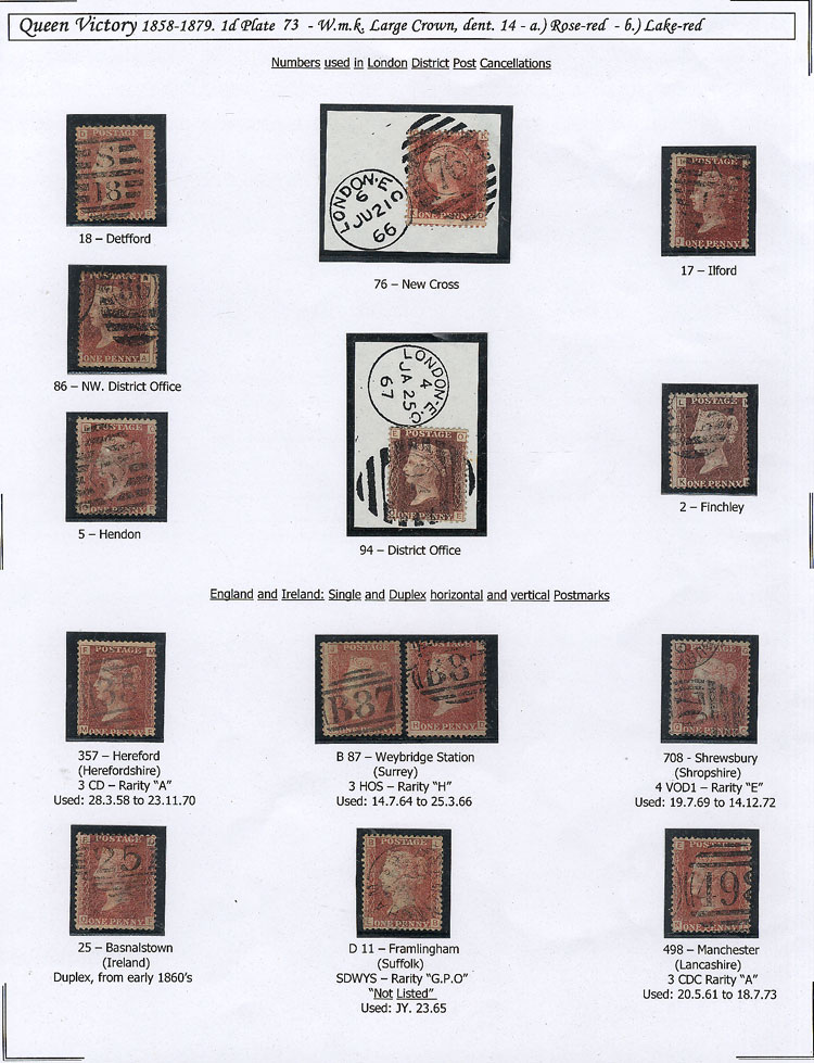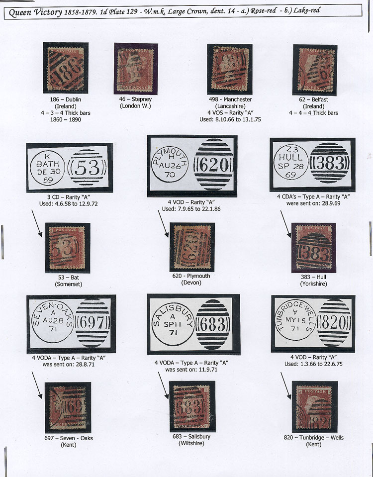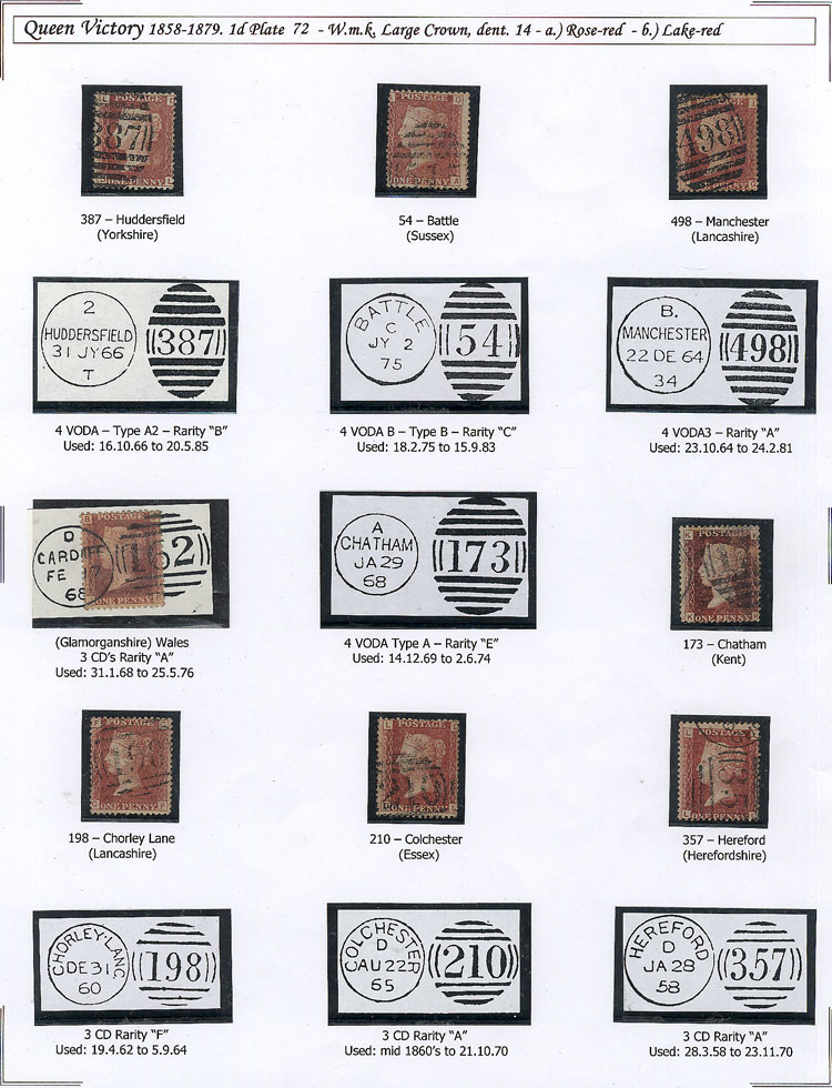 CANCELS on the 1p. of 1864 (Sc.33, SG.43), developed on pages according to the plate number, including some multiples, fragments and several covers (in total 44 covers and 449 stamps that include fragments, pairs and even a strip of 6!),