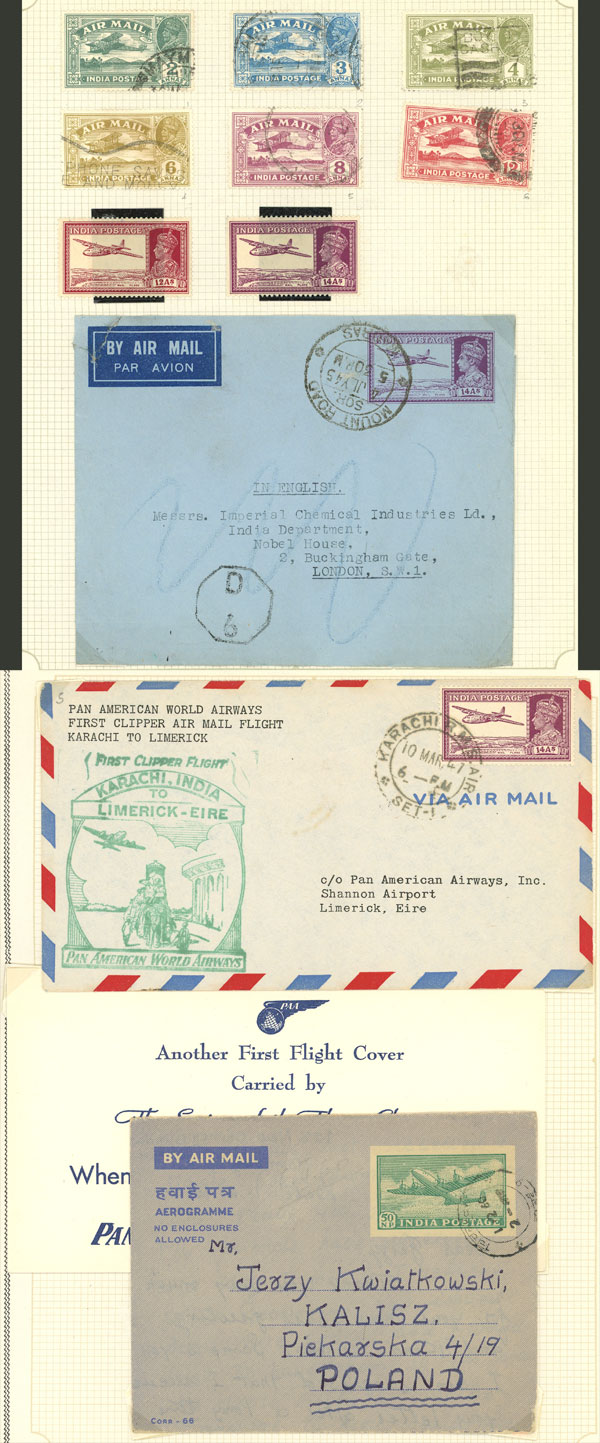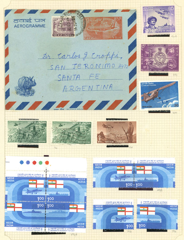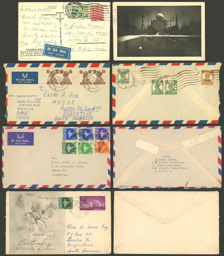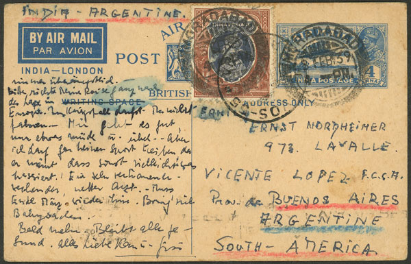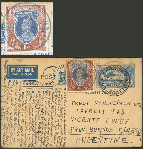 4a. Postal card + additional postage of 1R. to pay the airmail fee from Moradabad to Argentina 22/AU/1939, with Olivos arrival 28/SE, very interesting, minor defects, rare destination! The Indian postsage has an interesting cancellation