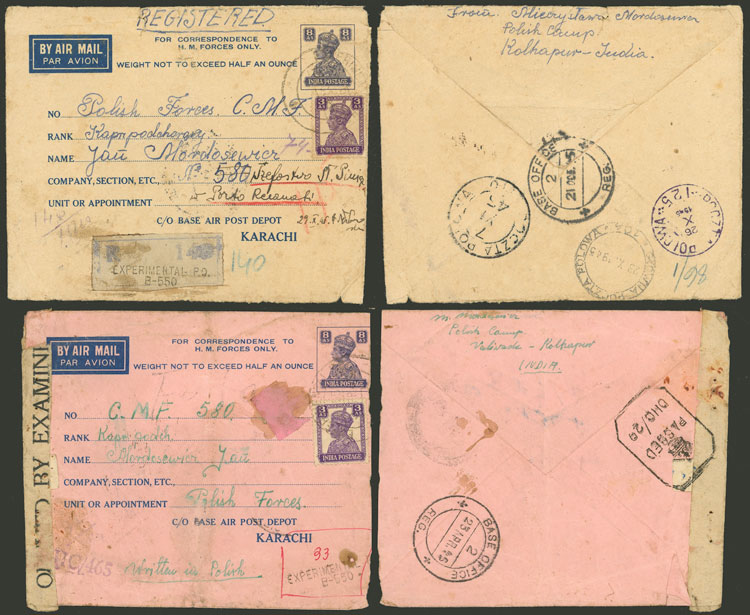 of aerograms sent to soldiers of the Polish Corps in 1945, both by registered mail and with "EXPERIMENTAL P.O. B-550" marks, very interesting! (Image)