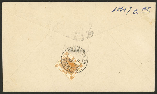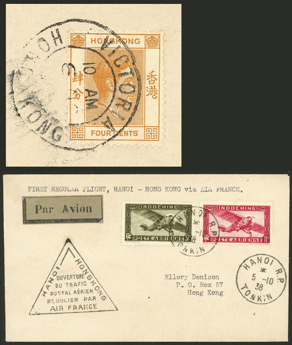 5/OC/1938 Hanoi - Hong Kong, first regular flight, with arrival backstamp over a Hong Kong stamp of 4c., VF quality! (Image) (Image-02)