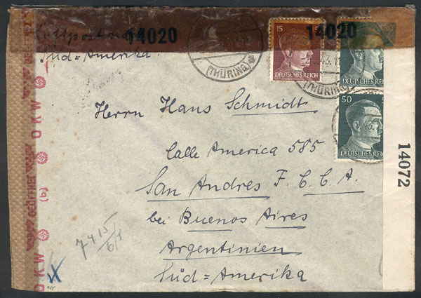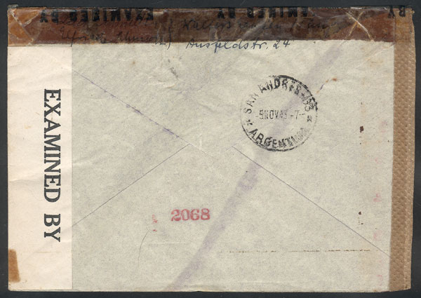 Airmail cover sent to Argentina on 2/SE/1943 with interesting TRIPLE CENSORSHIP, VF quality! (Image) (Image-02)