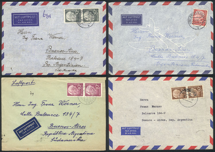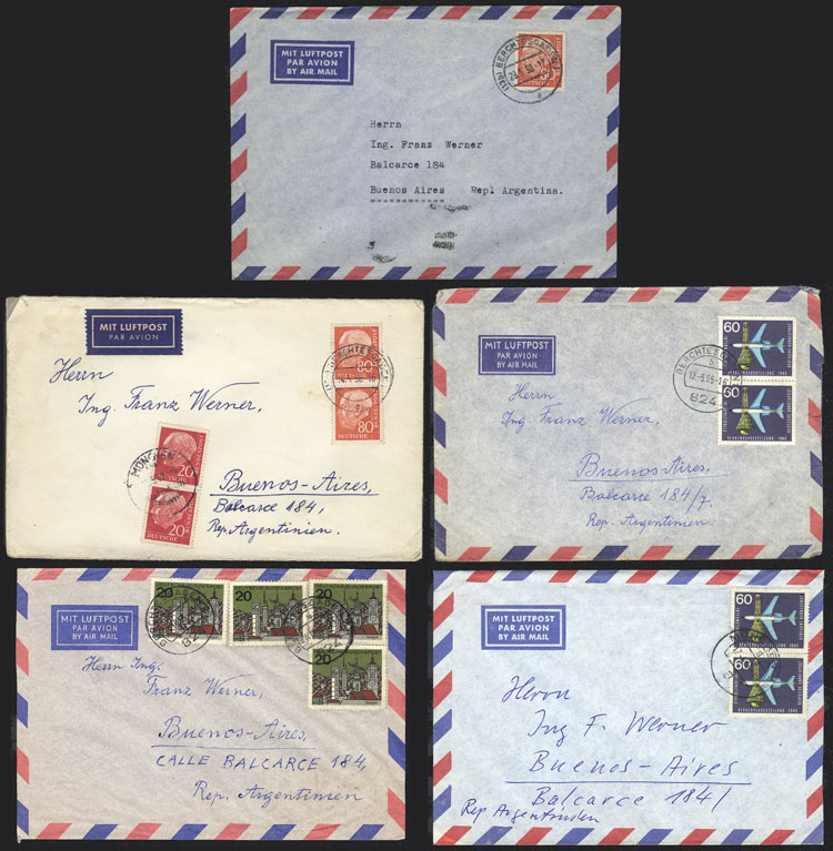 Covers sent to Argentina between 1954 and 1965 with varied postages, general quality is very ifne, Michel catalog value Euros 270+ (approx. US$370+), low start!