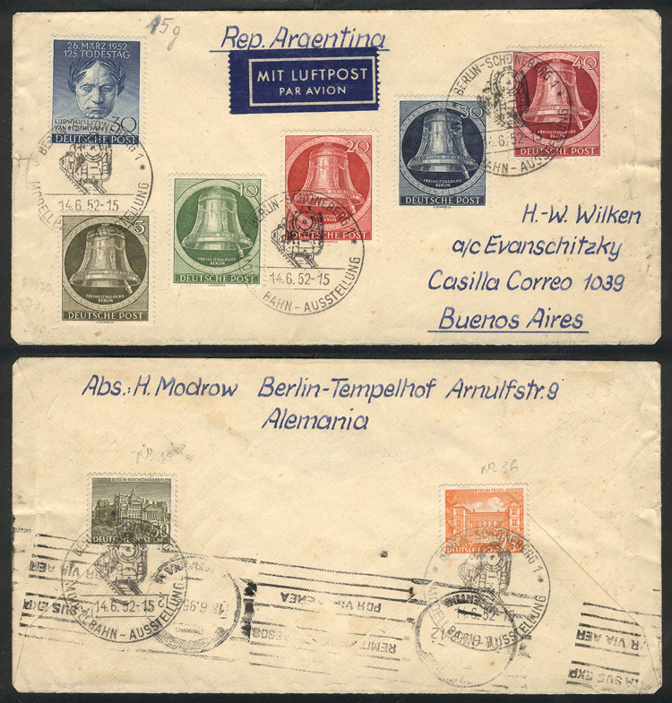 cover sent to Argentina on 14/JUL/1952, franked by Yvert 68/72 + 73 + other values on back, with beautiful postmark of a TRAIN exhibition, catalog value of the stamps (as used) is Euros 150, very nice! (Image)