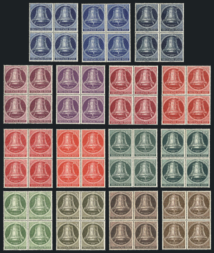 + 68/72 + 87/91, 1951, 1952 and 1953 Liberty Bell, the 3 complete sets of 5 values in blocks of 4, the top stamps are very lightly hinged (barely visible mark), and bottom stamps MNH, excellent quality, catalog value Euros 1,030. (Image)