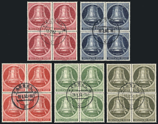 68/72, 1952 Liberty Bell, cpml. set of 5 values in used BLOCKS OF 4, excellent quality, Yvert catalog value Euros 440. (Image)