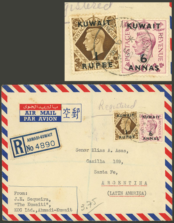 Registered airmail cover sent from Ahmadi to Argentina on 19/OC/1952, VF quality, rare destination! (Image) (Image-02)