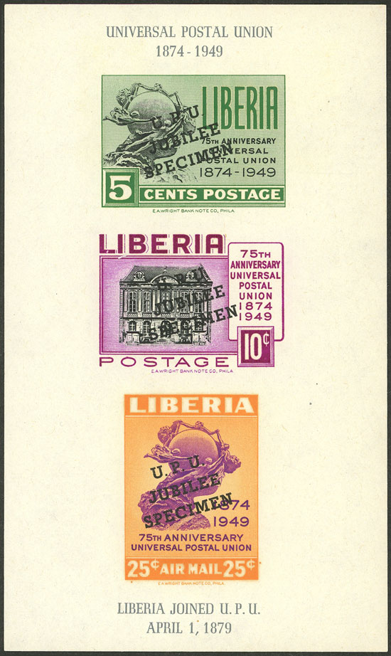 Sc.C67a, 1950 UPU 75 years, souvenir sheets with 3 values overprinted "U.P.U. - JUBILEE - SPECIMEN", MNH, excellent quality! (Image)