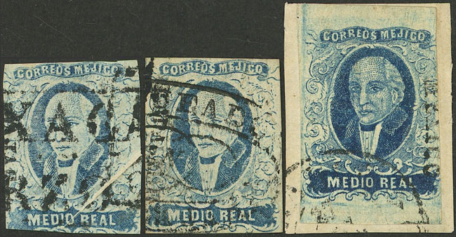 1856 ½R. blue, 3 used examples with different cancels, one with variety: PAPER FOLD, VF general quality! (Image)